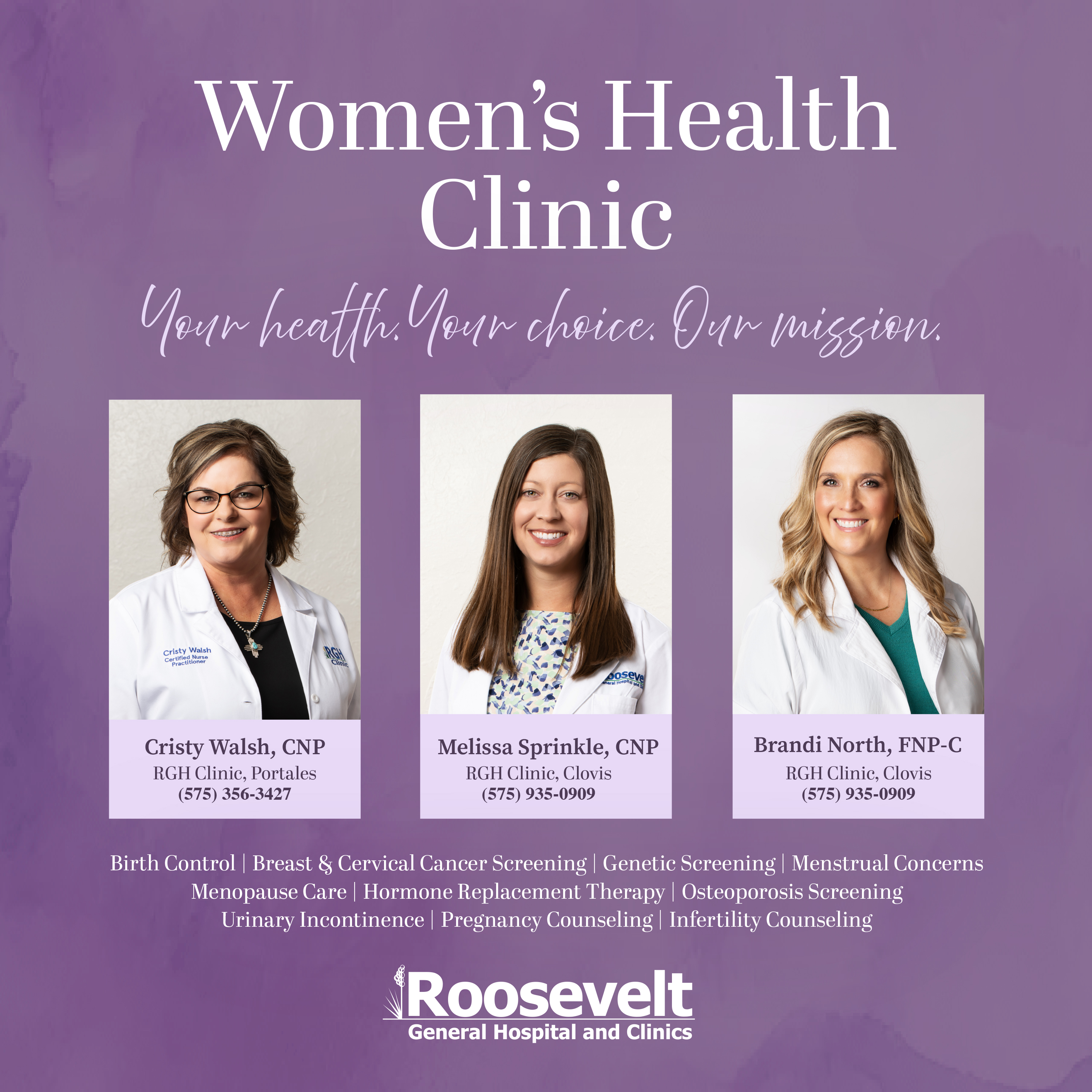 We know how important women's health is and RGH is committed to providing exceptional women's health care. Roosevelt General Hospital and Clinics has two women's health clinics, located in Portales and Clovis, New Mexico. Both are staffed with professionally trained and certified providers who are passionate about women's health.
